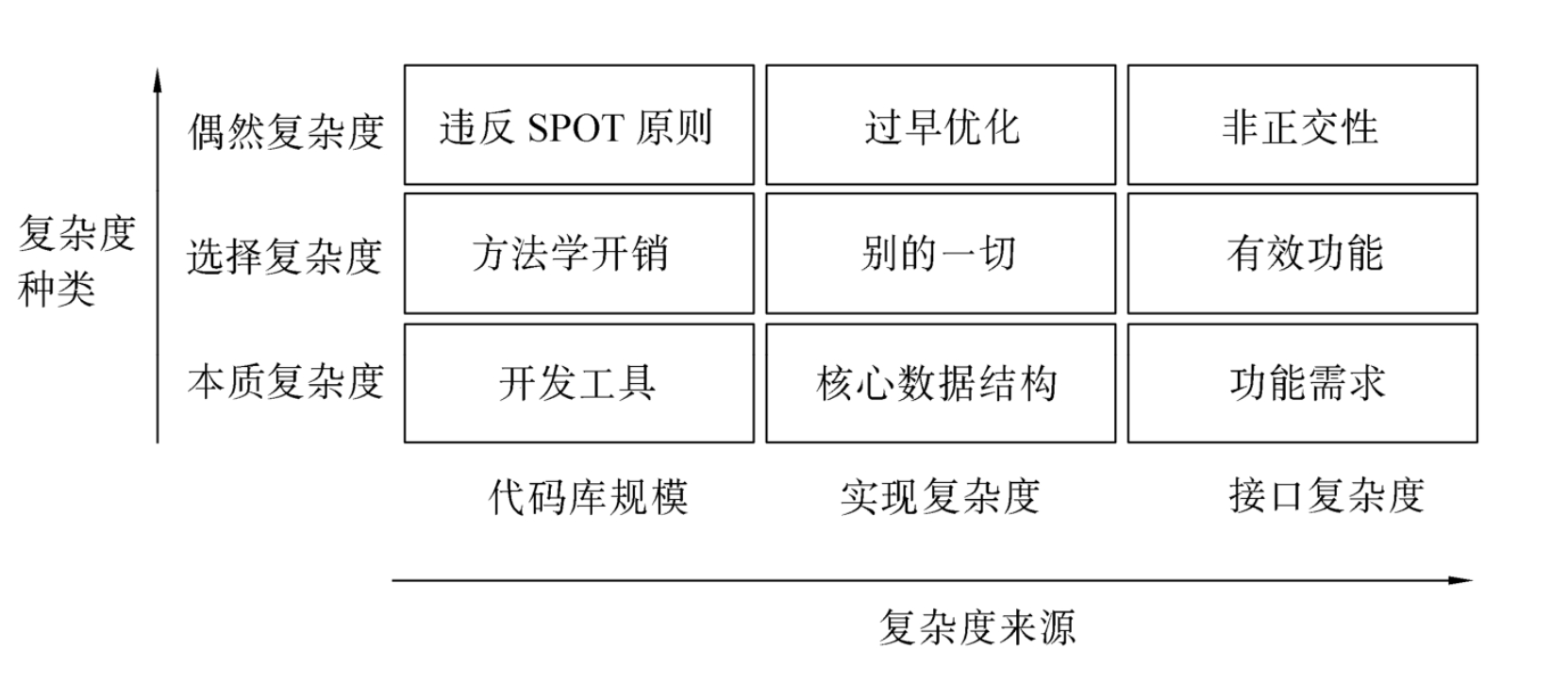 • 偶然复杂度的产生是因为没有找到实现规定功能集合的最简方法。偶然复杂度可以由良好的设计或重新设计来去除。另一方面,选择复杂度,同某个期望的功能相关联,只能由改变工程的目标来去除。